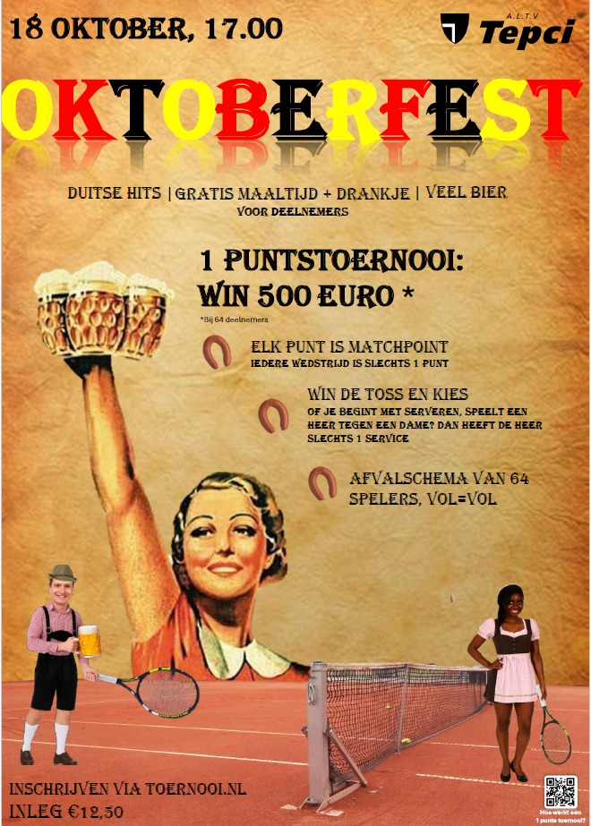 Schrijf je NU in voor dit unieke event bij Tepci! Een 1-puntstoernooi voor maximaal 64 deelnemers tijdens een Oktoberfest! Dat wil je toch niet missen??